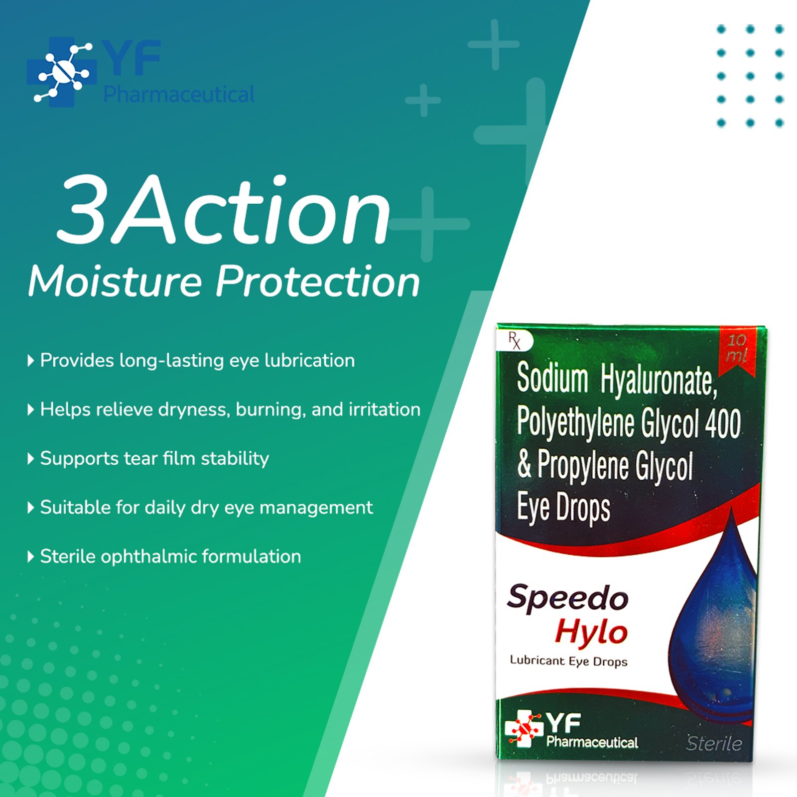 Speedo Hylo Lubricant Eye Drops is a sterile ophthalmic formulation designed to provide effective and long-lasting relief from dry, irritated, and fatigued eyes. It contains a balanced combination of Sodium Hyaluronate, Polyethylene Glycol 400, and Propylene Glycol, which work together to lubricate the ocular surface and maintain optimal moisture levels.